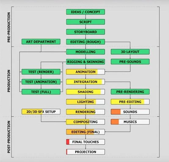 A detailed design of the animation is created, including the planning of sequences, character poses, cameras, and visual effects. A solid structure is established to guide the animation process.
